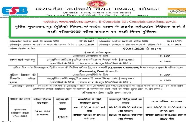 भोपाल (इजहार खान): मध्य प्रदेश में 8 साल बाद 500 पुलिस सब इंस्पेक्टर और सूबेदारों की भर्ती प्रक्रिया शुरू हुई है। ESB वेबसाइट पर विज्ञापन अपलोड किया गया है।
