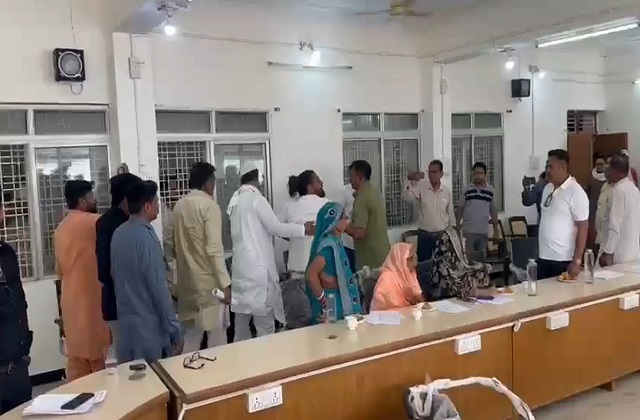 टीकमगढ़ (आमिर खान) : नगर पालिका परिषद टीकमगढ़ के उस समय हंगामा मच गया जब भाजपा पार्षद अजय यादव ने उत्पात मचा डाला। भाजपा पार्षद ने बैठक में नगर पालिका के कर्मचारियों को जमकर गालियां दी। साथ ही गुस्से में कुर्सी को उठाकर भी फेंका। इसे देख महिला पार्षद चिल्लाती नजर आई। भाजपा पार्षद का यह उत्पात करीब 30 मिनट तक जारी रहा।
