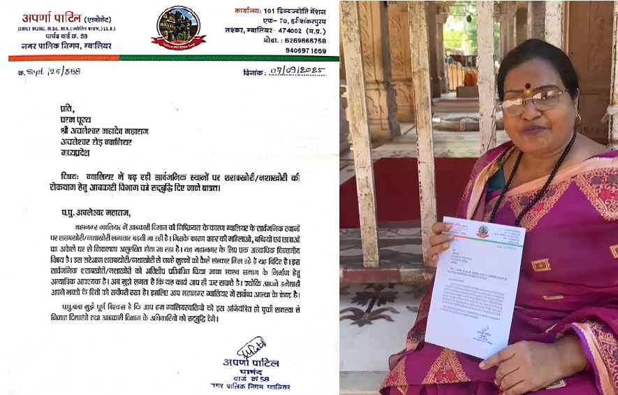 ग्वालियर: ग्वालियर में लगातार बढ़ रही शराबखोरी और नशाखोरी की घटनाओं को रोकने के लिए वार्ड क्रमांक 58 की BJP पार्षद अपर्णा पाटिल ने गंभीर पहल की है। उन्होंने नगर निगम और आबकारी विभाग को जागरूक करने के साथ-साथ पद्म पूज्य श्री अचलेश्वर महादेव से भी व्यवस्था सुधारने का भावनात्मक आग्रह किया।