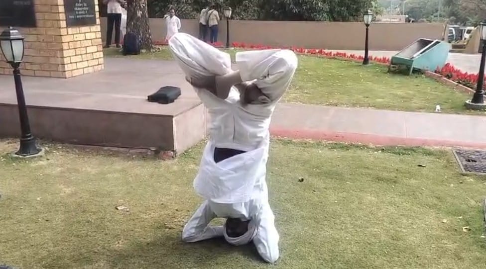 विधानसभा के बाहर गांधी प्रतिमा के सामने सिर के बल खड़े होकर विधायक ने शुरू की तपस्या, लगाए गंभीर आरोप