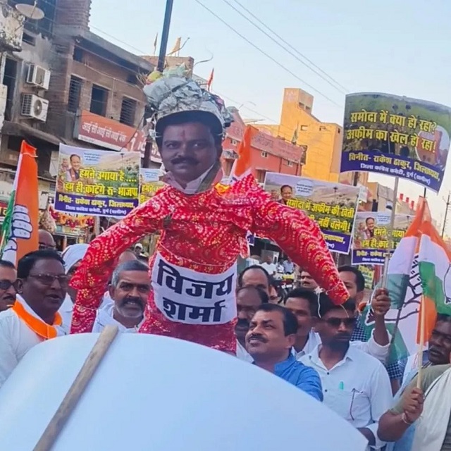 बड़ी संख्या में एकत्रित कार्यकर्ताओं ने रैली के रूप में नगर में नारेबाजी करते हुए सरकार के खिलाफ प्रदर्शन किया और बाद में गृह मंत्री विजय शर्मा का पुतला दहन किया। प्रदर्शन के दौरान कार्यकर्ताओं का आक्रोश इतना तीव्र था कि मौके पर मौजूद पुलिस बल भी पुतला दहन को रोक नहीं सका। कांग्रेस कार्यकर्ता लगातार सरकार विरोधी नारे लगाते हुए अफीम प्रकरण में दोषियों के विरुद्ध कठोर कार्रवाई की मांग करते रहे।