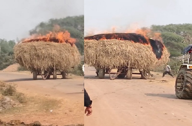 चलते ट्रैक्टर से टकराया बिजली का तार, ट्राली में भड़की भयंकर आग, फिर चालक ने दिखाई होशयारी