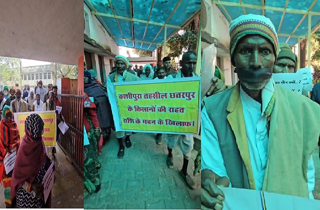 छतरपुर (राजेश चौरसिया): छतरपुर जिला मुख्यालय पर मंगलवार को आयोजित जिला स्तरीय जनसुनवाई में उस वक्त हड़कंप मच गया जब छतरपुर तहसील क्षेत्र के काशीपुरा गांव से दर्जनों किसान मुंह पर काली पट्टी बांधकर प्रदर्शन करने पहुंचे। छतरपुर की कांग्रेस नेत्री दीप्ती पाण्डेय के नेतृत्व में आए इन किसानों ने सूखा और अतिवृष्टि राहत राशि के वितरण में हुई करोड़ों की धोखाधड़ी के खिलाफ मोर्चा खोलते हुए अपर जिला मजिस्ट्रेट मिलिन्द नागदेवे और डिप्टी कलेक्टर विशा माधवानी को ज्ञापन सौंपा।