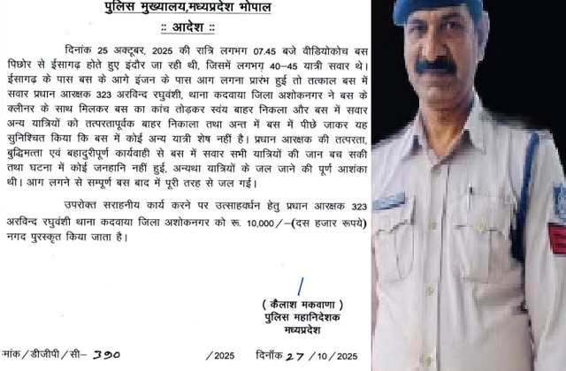 (इजहार खान): प्रधान आरक्षक अरविंद रघुवंशी को 10 हजार रुपये के ईनाम से नवाजा गया है। ये इनाम रघुवंशी को उनकी होशयारी और बहादुरी के लिए दिया गया है। दरसअल 25 अक्टूबर 2025 को वीडियोकोच बस पिछोर से ईसागढ़ होते हुए इंदौर जा रही थी, इसी दौरान बस के आगे इंजन के पास आग लगना शुरु हुई और बस में दहशत का माहौल बन गया। उस समय बस मे 40 से 45 यात्री सवार थे।