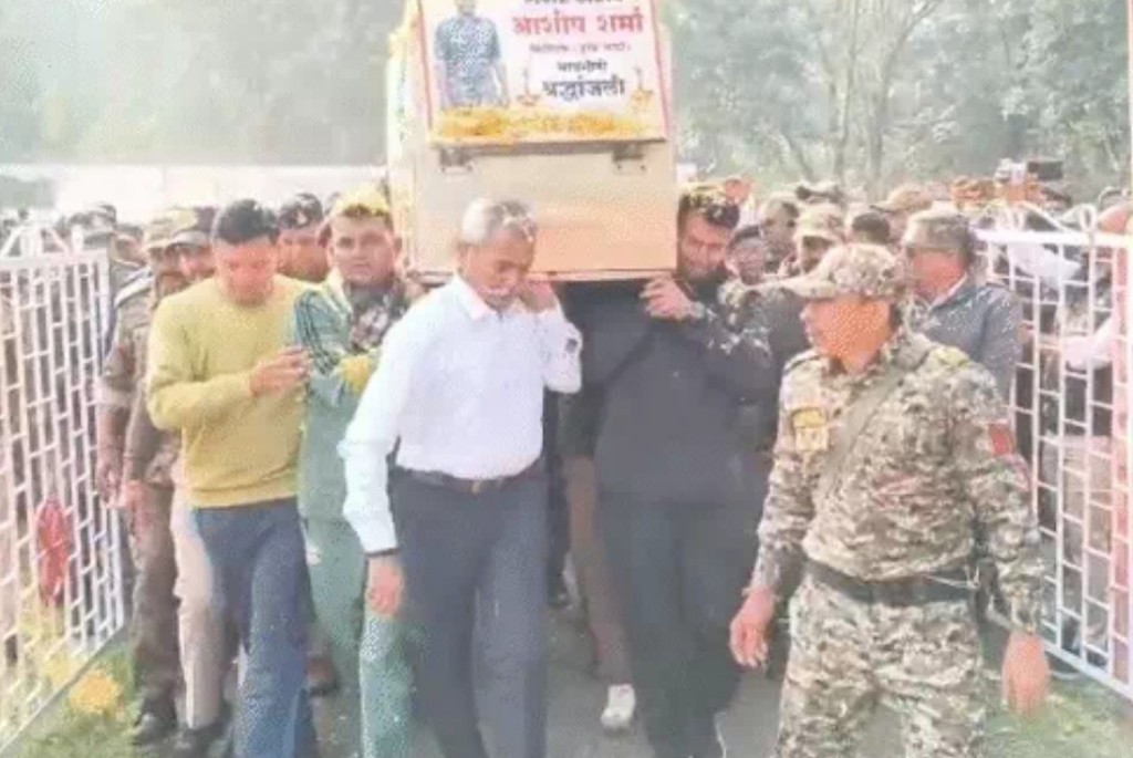 अंतिम यात्रा के दौरान SP आदित्य मिश्रा की आँखें भर आईं। शहीद के तिरंगे में लिपटे पार्थिव शरीर को देखकर उन्होंने जवानों को गले लगाया और ढांढस बंधाया। पूरा माहौल गमगीन हो गया। भीड़ में मौजूद आम लोगों से लेकर अफसरों तक—हर किसी की आंखें नम दिखीं।