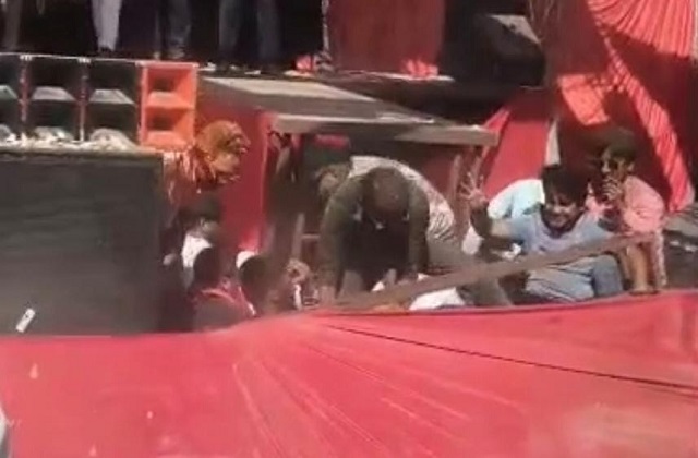 दरअसल बुधवार को होली मिलन समारोह आयोजित किया गया था जिसमें भाजपा जिला अध्यक्ष सुंदरलाल शाह क्षेत्रीय विधायक और अपने अन्य साथियों के साथ शामिल होने पहुंचे थे। भाजपा जिला अध्यक्ष स्टेज पर भाषण दे रहे थे। कार्यक्रम में एंट्री के लिए 3 सौ रुपए फीस रखी गई थी। जिला अध्यक्ष युवाओं को संबोधित कर कार्यक्रम की तारीफ के पुल बांध हो रहे थे। सभी जमकर जय श्री राम के नारे लगा रहे थे। तभी स्टेज अचानक भरभरा कर गिर गया। स्टेज टूटते ही भाजपा जिला अध्यक्ष भी नीचे गिर पड़े जिन्हें लोगों ने दौड़कर तुरंत उठाया हालांकि, इसके बाद नेता जी तुरंत उठे और ‘यह हिंदुओं का कार्यक्रम है और हिंदू कभी झुकते नहीं हैं’ कहकर माहौल को सामान्य करने की कोशिश की। इसका एक वीडियो सोशल मीडिया पर वायरल हो रहा है।