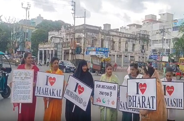 उज्जैन: मध्य प्रदेश में पोस्टर विवाद के बीच उज्जैन से एक सकारात्मक खबर सामने आई है। मंगलवार को फ्रीगंज टॉवर पर महिलाओं ने हाथों में पोस्टर लेकर देश में धार्मिक और सांप्रदायिक एकता का संदेश दिया। इस दौरान पोस्टरों में लिखा था.. ‘आई लव मोहम्मद, आई लव महाकाल, आई लव ईसा मसीह, आई लव संविधान, आई लव भारत’ और एक पोस्टर पर लिखा था ‘हम भारतवासी सब एक हैं।’