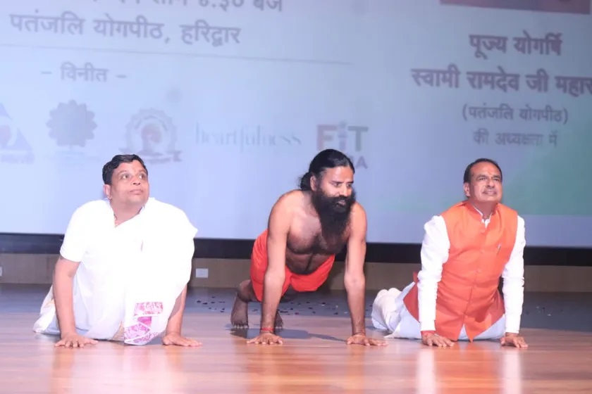 CM शिवराज ने बाबा रामदेव और आचार्य बालकृष्ण के साथ किया सूर्य नमस्कार
