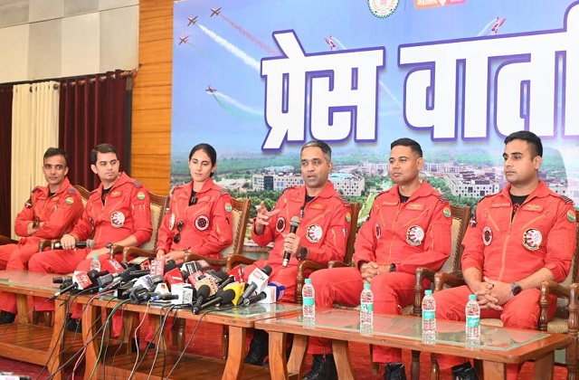 पत्रकार वार्ता में सूर्य किरण टीम के सदस्य ग्रुप कैप्टन श्री सिद्धेश कार्तिक, स्क्वाड्रन लीडर श्री जसदीप सिंह, श्री राहुल सिंह, श्री गौरव पटेल, श्री संजेश सिंह और फ्लाइट लेफ्टिनेंट सुश्री कंवल संधू शामिल थे।