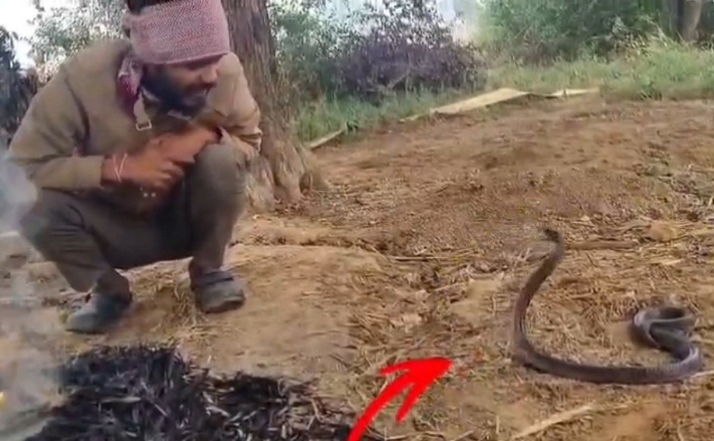 वायरल वीडियो में एक युवक आग के सामने आराम से बैठा नजर आता है, और उसके ठीक बगल में फन फैलाए हुए एक विशाल काला नाग भी मौजूद है। हैरानी की बात यह है कि युवक न सिर्फ बेखौफ होकर सांप के पास बैठा है, बल्कि बड़े ही मजाकिया और आत्मीय अंदाज में उससे बातचीत करता दिखाई देता है।