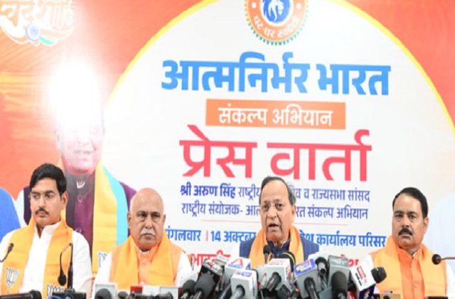 बीजेपी राष्ट्रीय महासचिव अरुण सिंह ने प्रदेश कार्यालय में पत्रकारों से मुखातिब होते हुए “हर घर स्वदेशी - घर-घर स्वदेशी” को जन आंदोलन बनाने की बात कही। अरुण सिंह ने कहा कि आज पूरा विश्व अपनी अर्थव्यवस्था और स्थानीय उत्पादों की ओर लौट रहा है। भारत भी इसी दिशा में निर्णायक कदम बढ़ा रहा है। उन्होंने कहा कि आत्मनिर्भर भारत अभियान ही विकसित भारत का वास्तविक मार्ग है।
