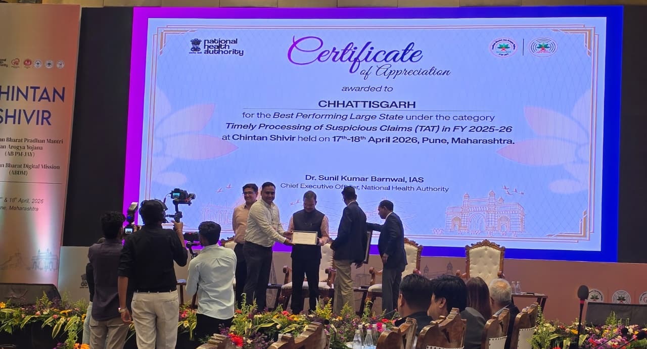 रायपुर (पुष्पेंद्र सिंह): आयुष्मान भारत प्रधानमंत्री जन आरोग्य योजना के प्रभावी क्रियान्वयन में उत्कृष्ट प्रदर्शन के लिए छत्तीसगढ़ को राष्ट्रीय स्तर पर दो प्रतिष्ठित पुरस्कारों से सम्मानित किया गया है। यह सम्मान भारत सरकार के राष्ट्रीय स्वास्थ्य प्राधिकरण द्वारा 17 और 18 अप्रैल 2026 को पुणे (महाराष्ट्र) में आयोजित चिंतन शिविर के दौरान प्रदान किए गए।
