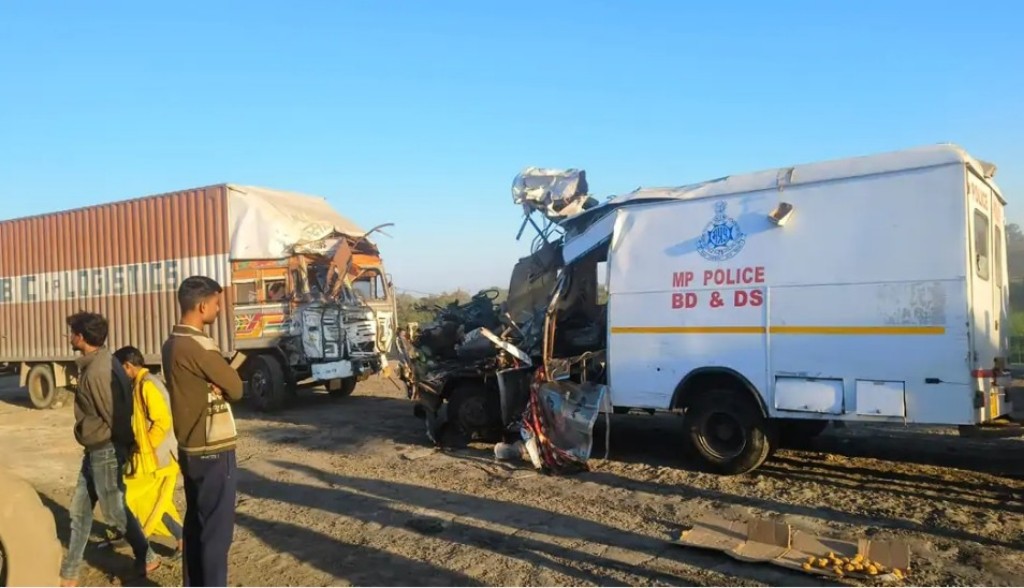MP में बड़ा हादसा: पुलिस वैन और कंटेनर की जबरदस्त टक्कर, 4 बहादुर जवानों की दर्दनाक मौत
