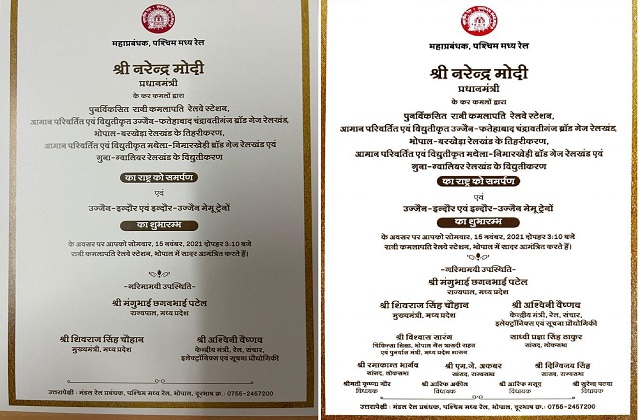 तड़के जो आमंत्रण पत्र छप कर आये हैं अब उसमें सिर्फ प्रधानमंत्री नरेंद्र मोदी राज्यपाल मंगू भाई पटेल रेल मंत्री अश्विनी वैष्णव और मुख्यमंत्री शिवराज सिंह चौहान का ही नाम रह गया है बाकी सभी विधायक सांसदों के नाम हटा दिए गए हैं।