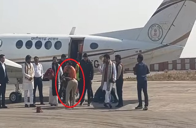पुलिस इंस्पेक्टर का जूते उतारकर, सैल्यूट करने के बाद बाबा बागेश्वर धाम के पैर छुए। ये वीडियो रायपुर के माना स्थित एयरपोर्ट का है। जानकारी के मुताबिक दुर्ग के भिलाईनगर में होने वाली 5 दिवसीय कथा के लिए बाबा बागेश्वर धाम के पीठाधीश्वर पंडित धीरेंद्र कृष्ण शास्त्री यहां पहुंचे हैं। वे छतीसगढ़ सरकार के राजकीय विमान से कौशल विकास मंत्री के साथ रायपुर पहुंचे थे।