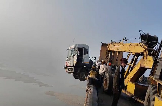 खौफनाक मंजर...चंबल नदी के पुल की रेलिंग तोड़ हवा में लटका ट्रक, कार को बचाने के चक्कर में हुआ हादसा